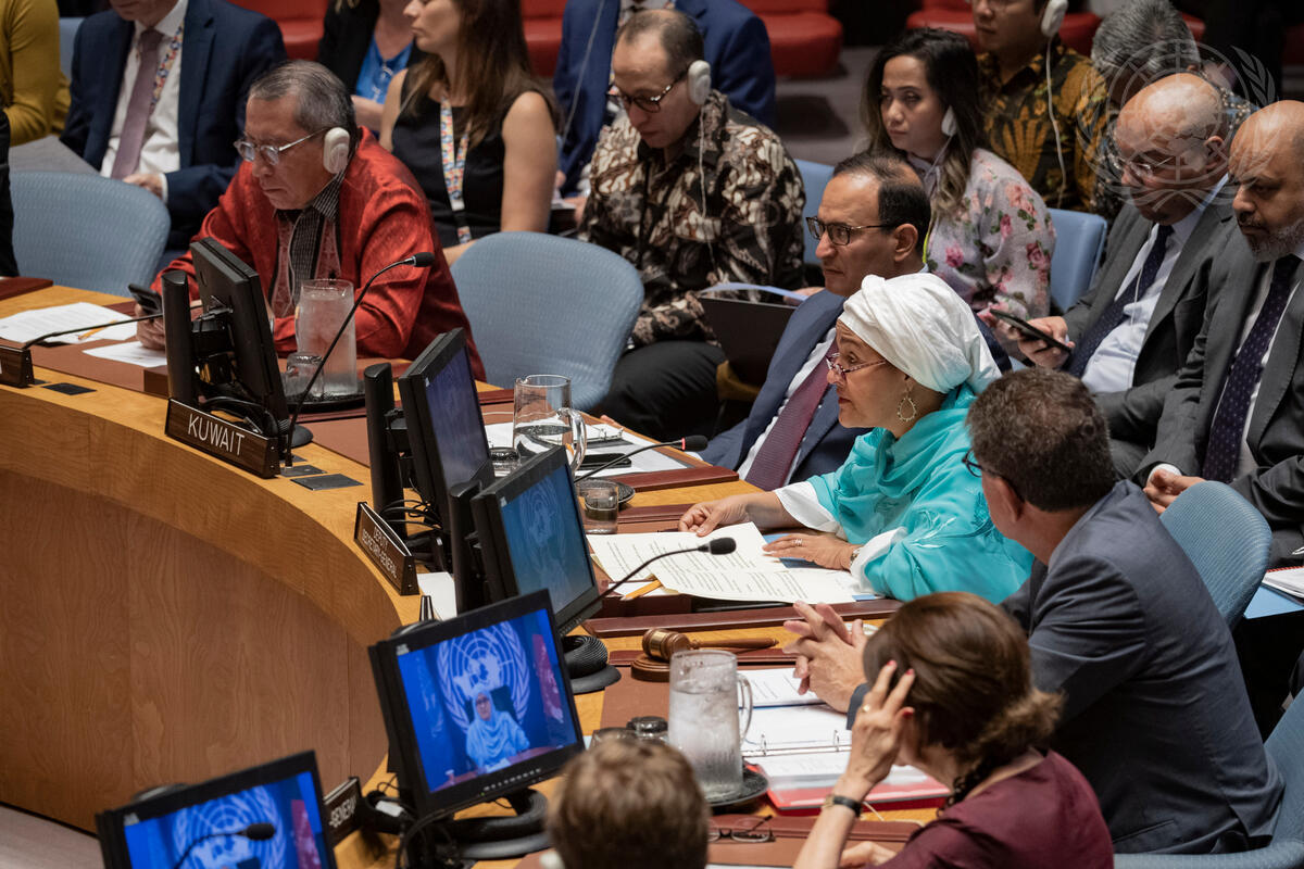 Deputy Secretary-General Amina Mohammed (centre) briefs the Security Council on the situation in Afghanistan and her recent visit to the country. To her left is Gustavo Meza-Cuadra Velásquez, Permanent Representative of Peru to the United Nations and President of the Security Council for the month of July, and to her right are Mansour Al-Otaibi, Permanent Representative of Kuwait to the UN, and Dian Triansyah Djani, Permanent Representative of Indonesia to the UN.