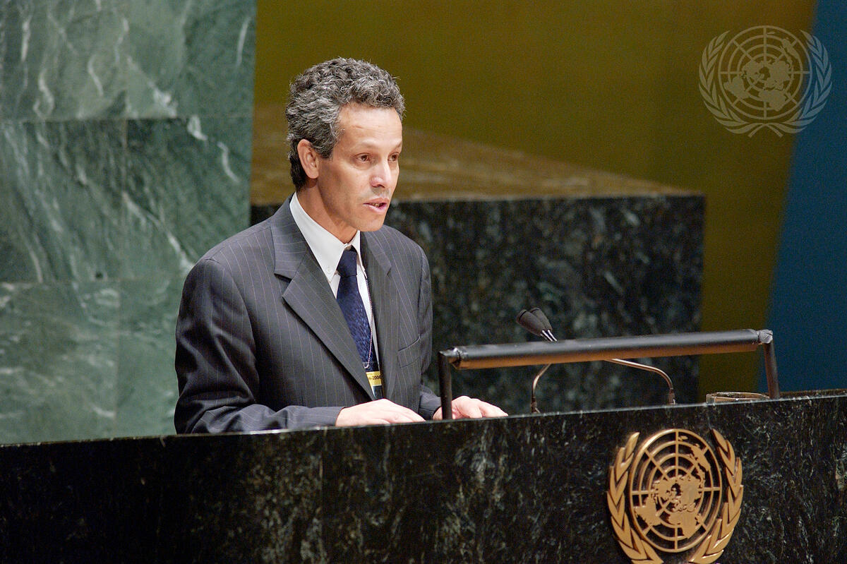 Moulay Lahcen Aboutahir, Deputy Permanent Representative of the Kingdom of Morocco to the United Nations, and speaking on behalf of the ""Group of 77"" developing countries and the People's Republic of China, addresses the General Assembly.