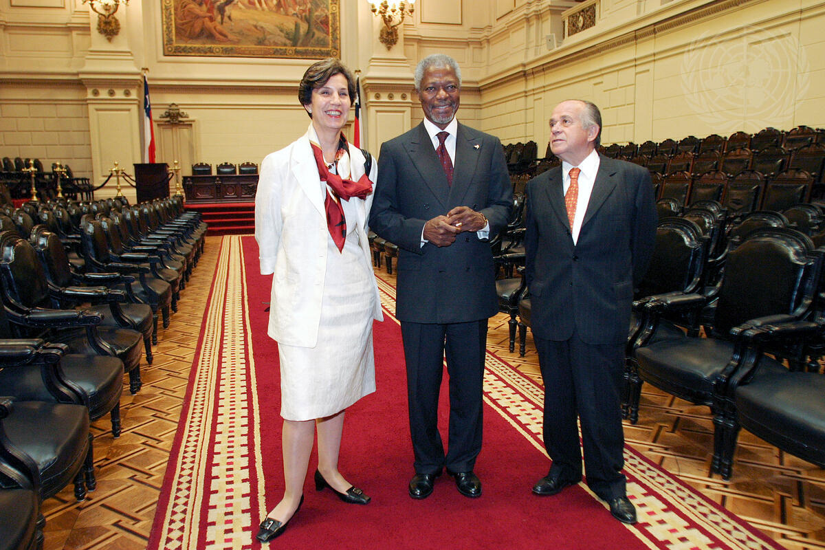 Secretary-General Kofi Annan visits the Chilean capital, Santiago de Chile, for the first leg of his four-country South American tour. Secretary-General Kofi Annan (centre) with Isabel Allende (left) and Andres Zoldivar (right), President of the Chilean Senate. They are standing in the former chambers of the Chilean Congress in Santiago.