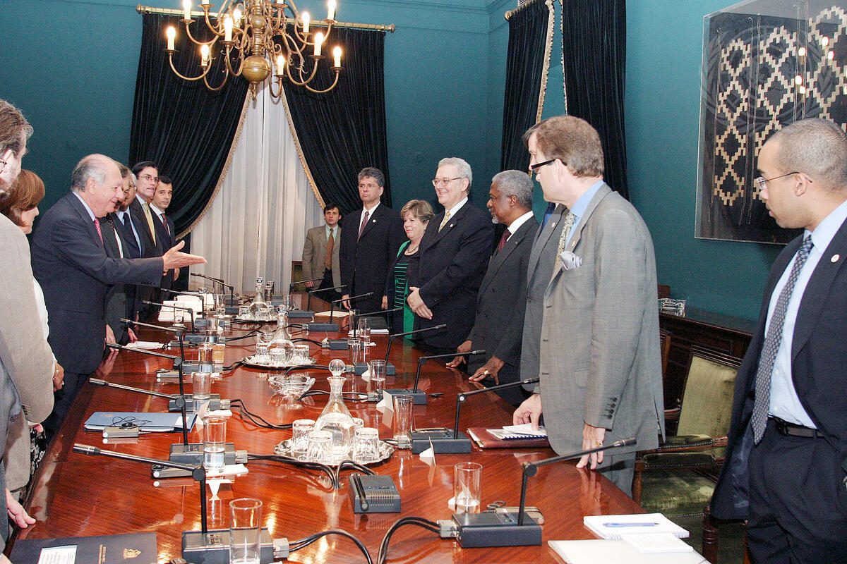 Secretary-General Kofi Annan visits the Chilean capital, Santiago de Chile, for the first leg of his four-country South American tour. Secretary-General Kofi Annan (standing, third from right) meeting with a United Nations and the UN Economic Commission for Latin America and the Caribbean (ECLAC) delegation at the Palacio de La Moneda with President Ricardo Lagos Escobar of Chile (standing left, hand extended).