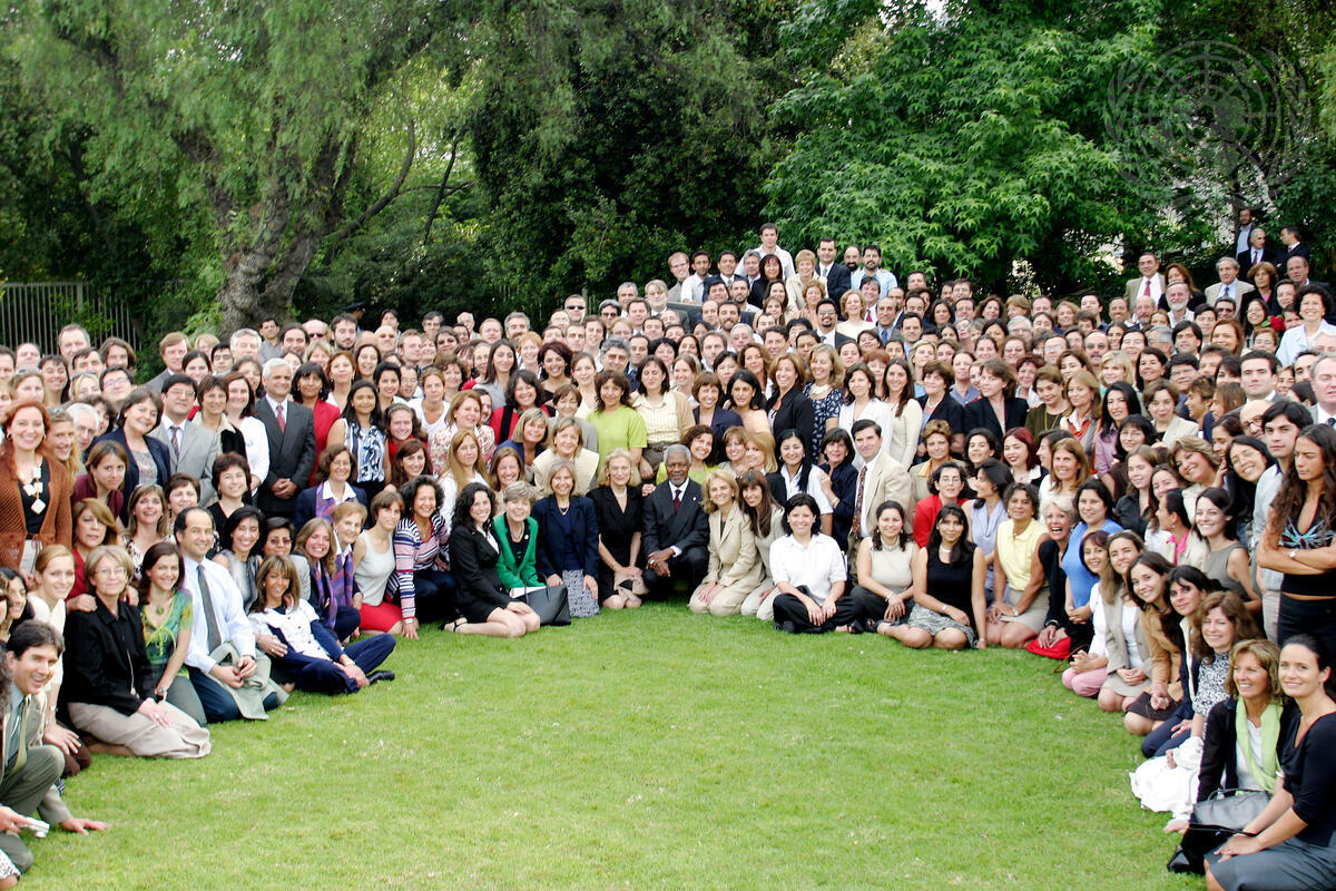 Secretary-General Kofi Annan visits the Chilean capital, Santiago de Chile, for the first leg of his four-country South American tour. Secretary-General Kofi Annan and Mrs. Nane Annan (seated front centre) with the staff from the United Nations Economic Commission for Latin America and the Caribbean (ECLAC).
