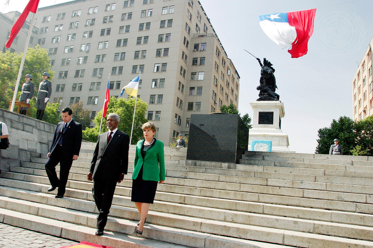 Secretary-General Kofi Annan (centre) and Alicia Barcena (right), acting Executive Secretary of the UN Economic Commission for Latin America and the Caribbean (ECLAC), after having participated in a wreath laying ceremony for General Bernardo O'Higgins.