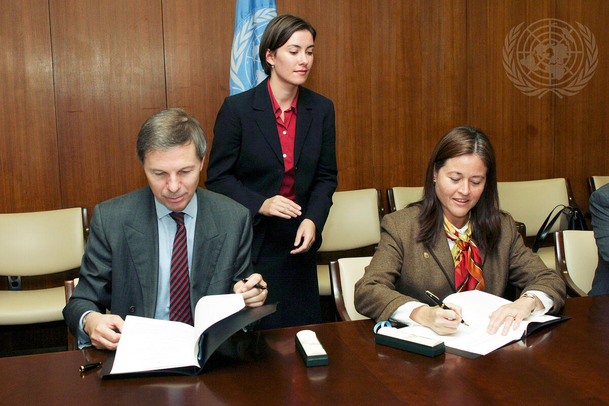 Jean-Marie Guéhenno (left), Under-Secretary-General for Peacekeeping Operations, and María Eugenia Brizuela de Ávila (right), Minister for Foreign Affairs of El Salvador, signed the Memorandum of Understanding on United Nations Stand-by Arrangements today at UN Headquarters.