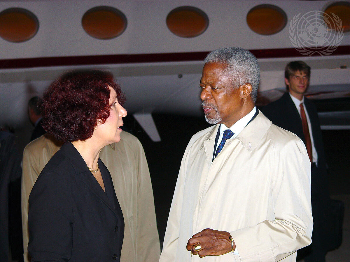 Ana Palacio (left), Minister for Foreign Affairs of Spain, welcomes Secretary-General Kofi Annan, shortly after his arrival.