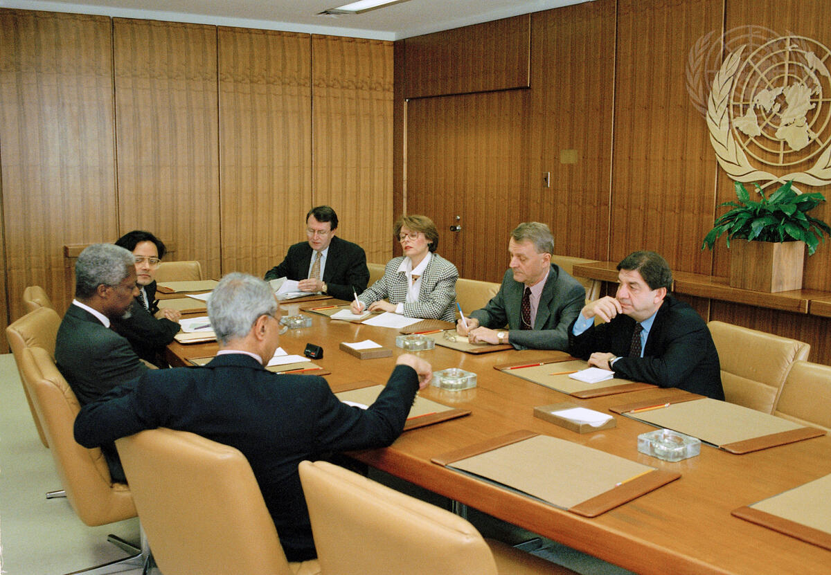 Secretary-General Kofi ANNAN (second from left) meets with his close aides and advisers.