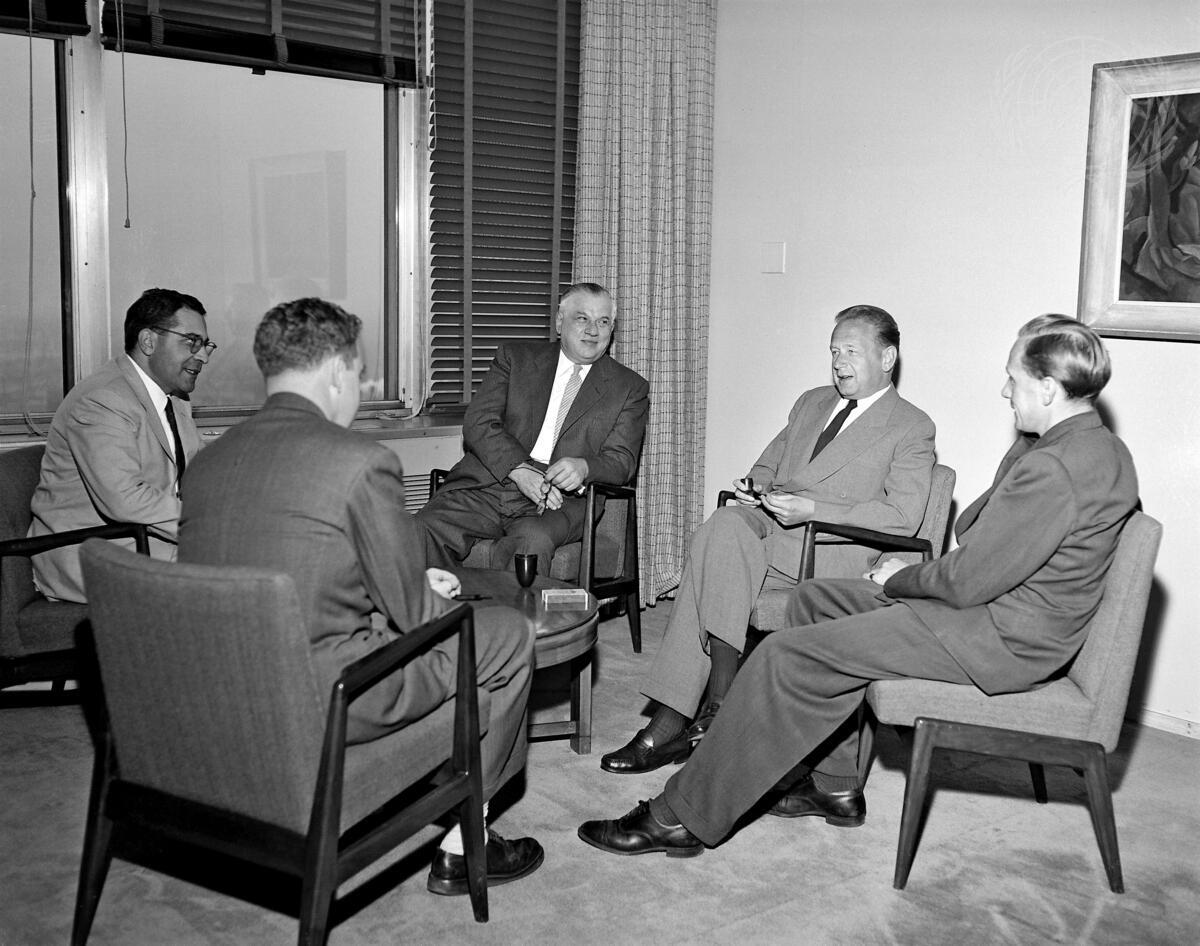 An informal conference between Secretary-General Dag Hammarskjöld and some high officials of his Executive Office. From left to right are: Mr. Leo Malania, Senior Officer, Office of the Executive Assistant; Mr. Victor Mills, Executive Officer, Office of the Executive Assistant; Mr. Andrew W. Cordier, Executive Assistant to the Secretary-General; Mr. Dag Hammarskjöld; and Mr. Brian E. Urquhart, Secretary of the forthcoming International Conference on the Peaceful Uses of Atomic Energy.