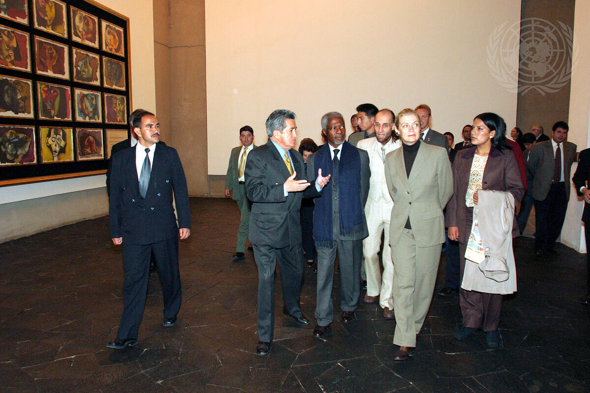 At the Guayasamin Foundation in Quito, Mr. Annan (centre) and Nane Annan (centre right) are escorted by Pablo Guayasamin (centre left), son of the artist, Oswaldo Guayasamin, who died four years ago.