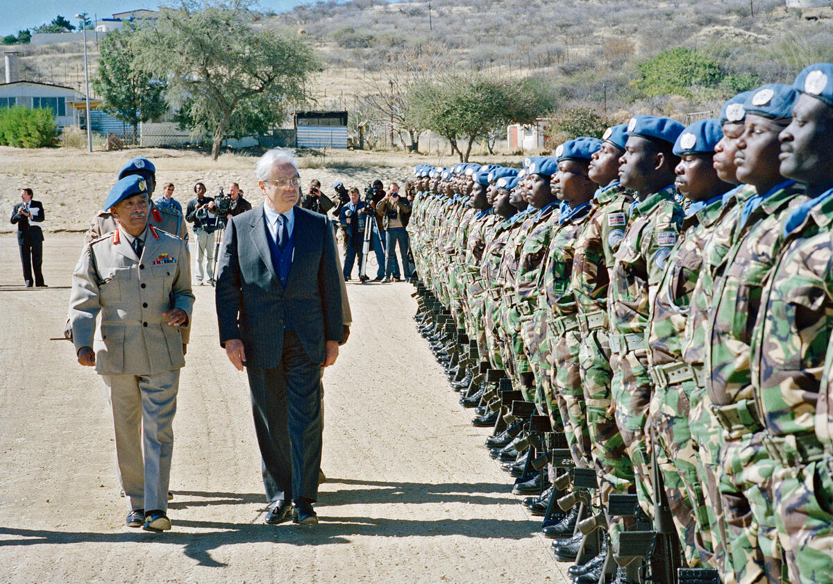 Secretary-General Javier Perez de Cuellar inspects the Kenyan battalion honuor guard at the UN Transition Assistance Group (UNTAG) Military Headquarters in Suiderhof Base, Windhoek, Namibia. He is accompanied by Lt. General Prem Chand, Force Commander of UNTAG. [Exact date unknown]