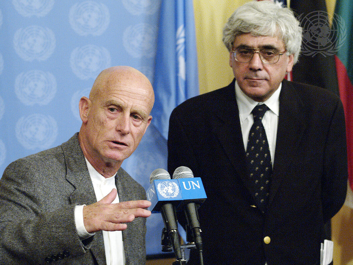 Ami Ayalon (left), retired Israeli Admiral, and Professor Sari Nusseibeh, President of Al Quds University of Jerusalem, address correspondents at the Security council stakeout.