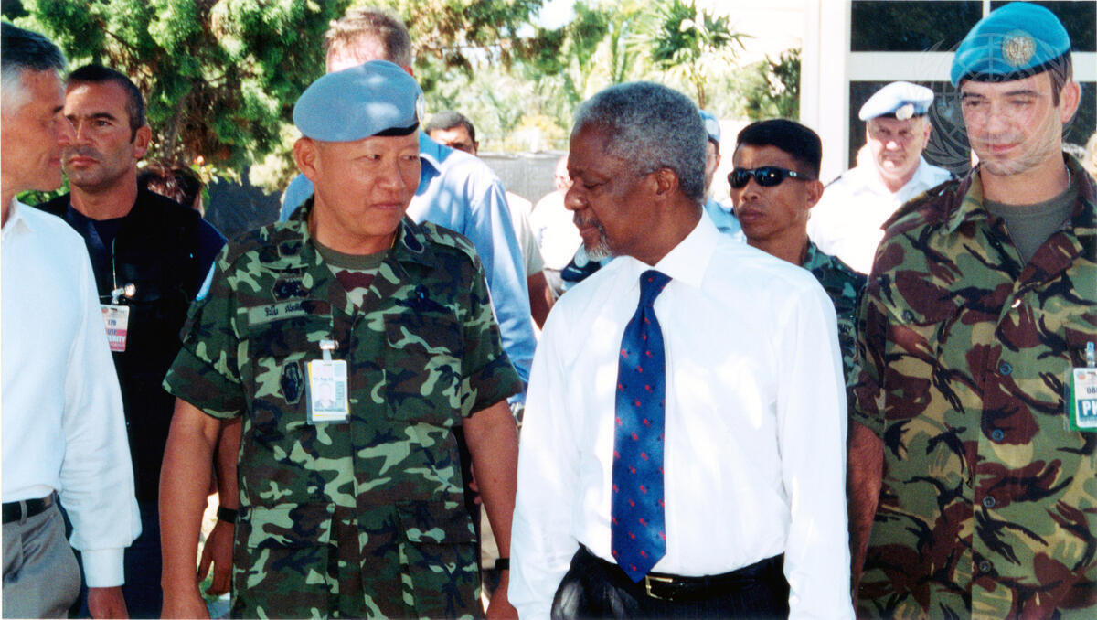 Sergio Vieira de Mello (extreme left), UN Transitional Administrator in East Timor, departs Timor-Leste (East Timor) in May 2002. At centre right is Secretary-General Kofi Annan.