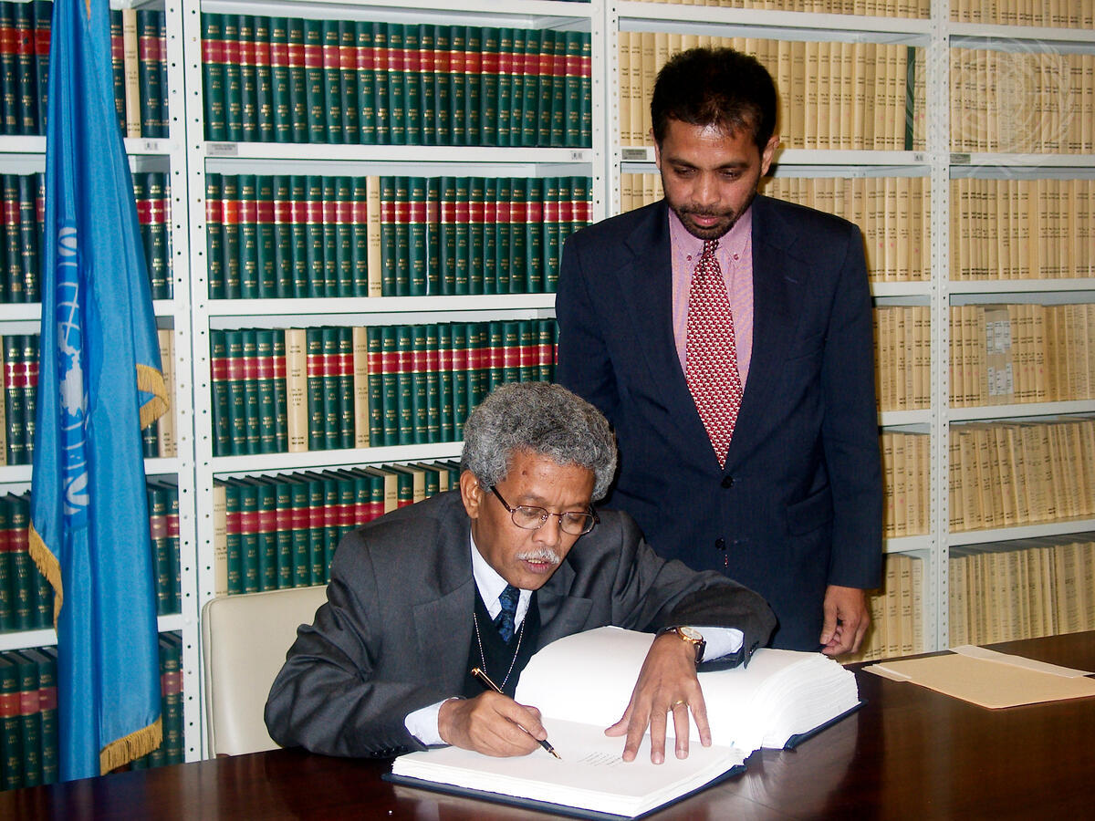 Ahmed Tahir Baduri (seated), Permanent Representative of Eritrea to the United Nations, signs the "Comprehensive Nuclear-Test-Ban Treaty". Standing right is Palitha T.B. Kohona, Chief of the Treaty Section.