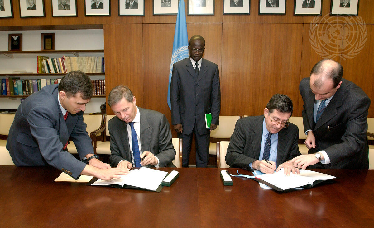 Jean-Marie Guéhenno (seated centre left), Under-Secretary-General for Peacekeeping Operations, signs on behalf of the United Nations the "Memorandum of Understanding on the United Nations Stand-by Arrangements System (UNSAS)" with Gert Rosenthal (centre right), Permanent Representative of Guatemala to the United Nations.