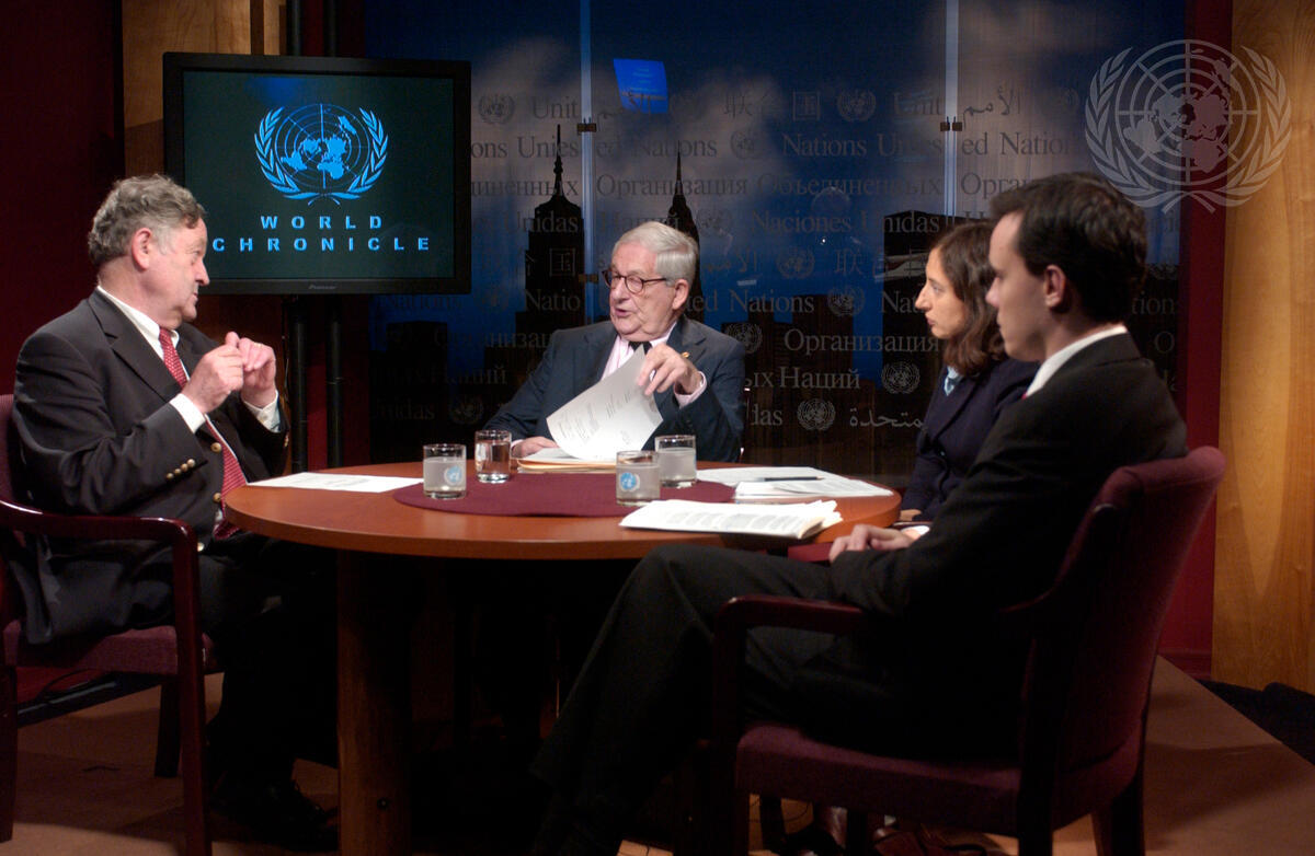 Theo van Boven (left), Special Rapporteur on Torture and Other Cruel, Inhuman or Degrading Treatment or Punishment, discusses ""Investigating and Reporting on Torture"" as a guest on World Chronicle today. Second from left is Moderator, Michael Litteljohns. Also present are Susannah Price, BBC, and Philippe Bolopion, Radio France Internationale/RFI.