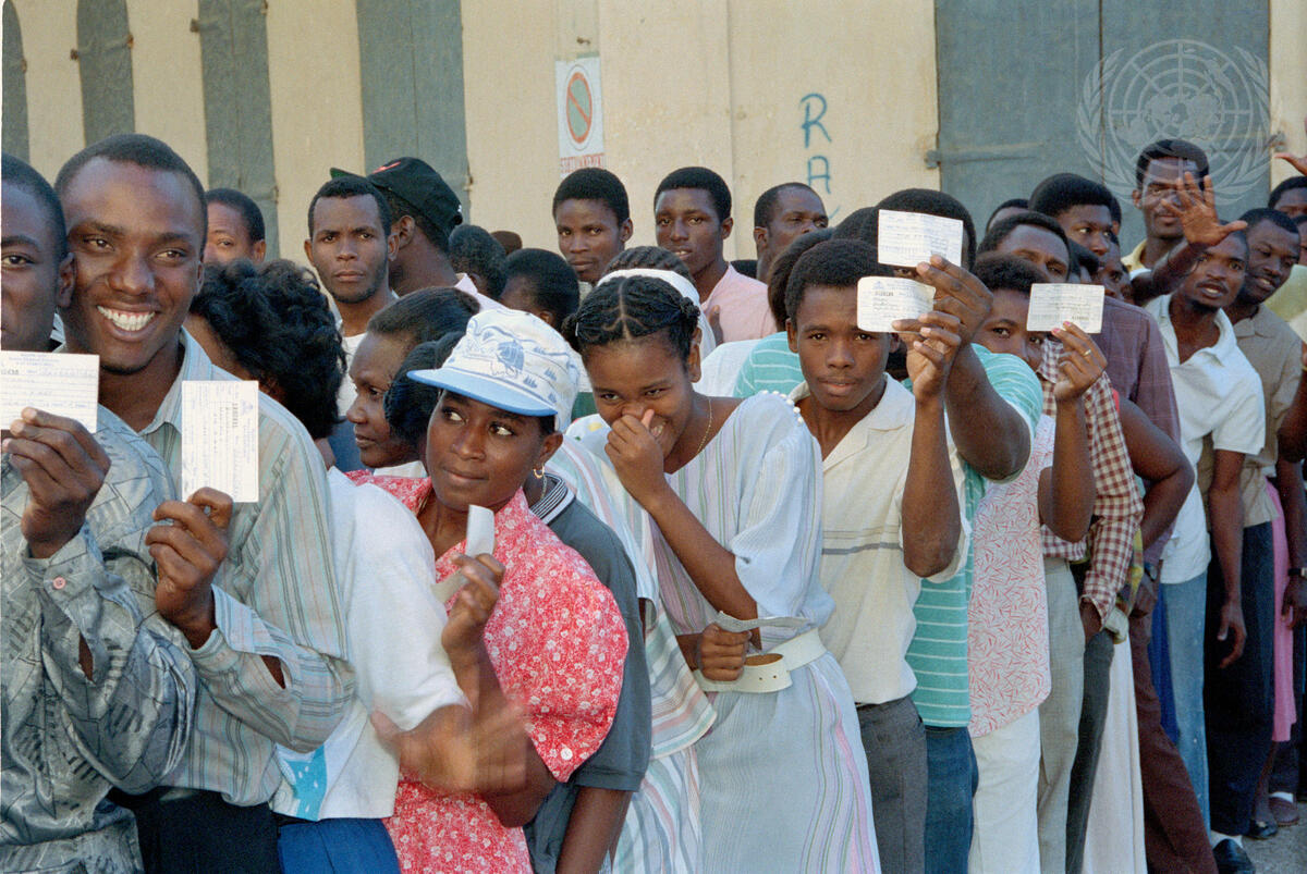Voters proudly display their registration cards as they wait to vote in the first peaceful, democratic presidential elections in Haiti's history. Assisting them in that process is the United Nations Observer Group for the Verification of Elections in Haiti (ONUVEH).