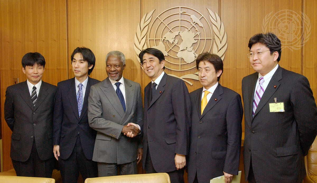 Secretary-General Kofi Annan (third from left) meets with Shinzo Abe (third from right), Acting Secretary-General of the Liberal Democratic Party (LDP) and Member of the House of Representatives of Japan, today at UN Headquarters.