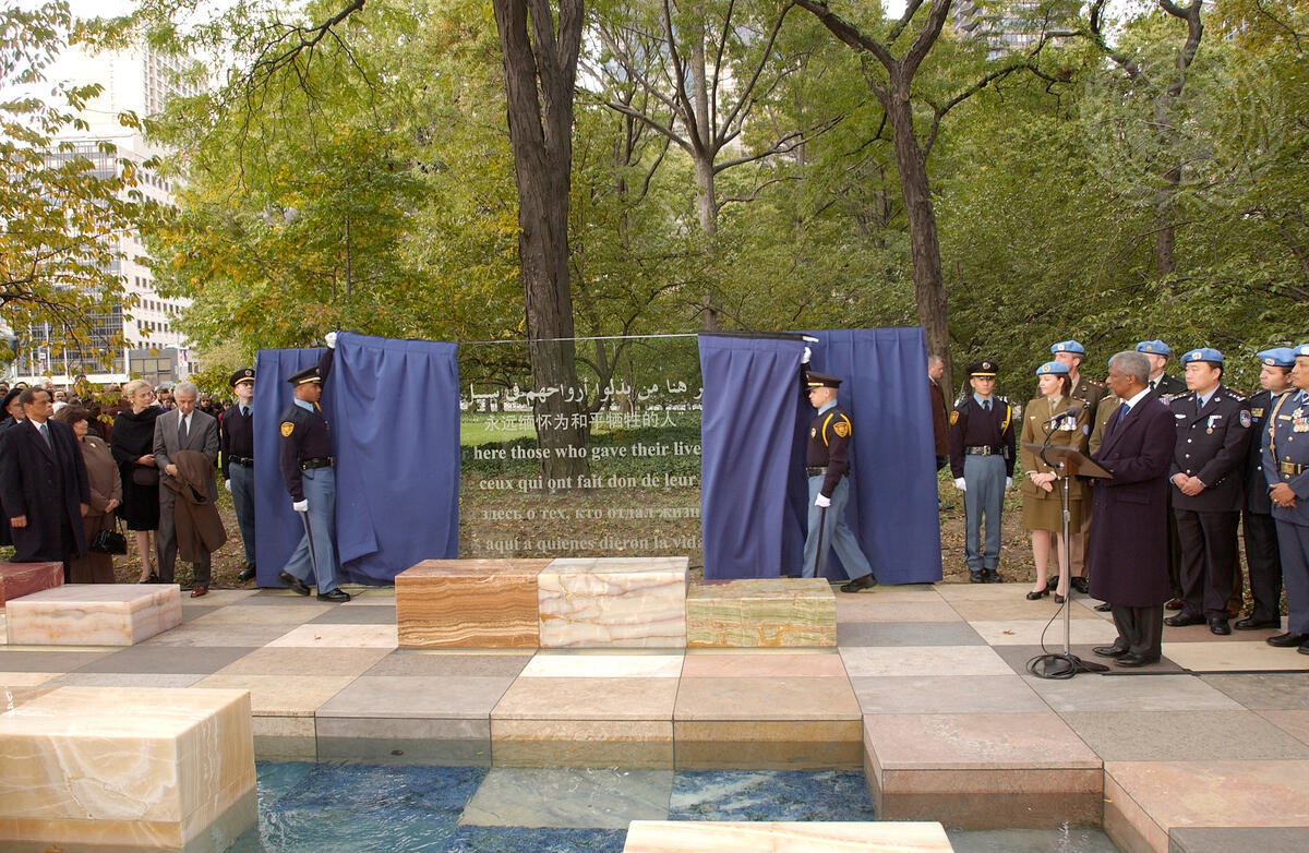Two memorials dedicated to United Nations staff killed in the course of their duties were unveiled today to mark UN Day, the annual event celebrating the birth of the organization in 1945. In New York, Secretary General Kofi Annan paid tribute to his fallen colleagues during the ceremony to open a memorial located in a wooded section of the headquarters' North Garden. The Memorial was funded from the 1988 Nobel Peace Prize award to the United Nations peacekeeping forces, the Memorial has as its centrepiece a wall of crystal glass with the words, ""Remember here those who gave their lives for peace"" inscribed in the six official languages of the Organization. A bubbling fountain in the centre of the Memorial projects sound into the space.