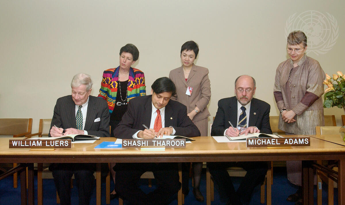 Signing of a memorandum of understanding today at UN Headquarters. From left to right: Bill Luers, President of the United Nations Association of the United States of America (UNA-USA); Shashi Tharoor, Under-Secretary-General for Communications and Public Information; and Michael Adams, President of Fairleigh Dickinson University.