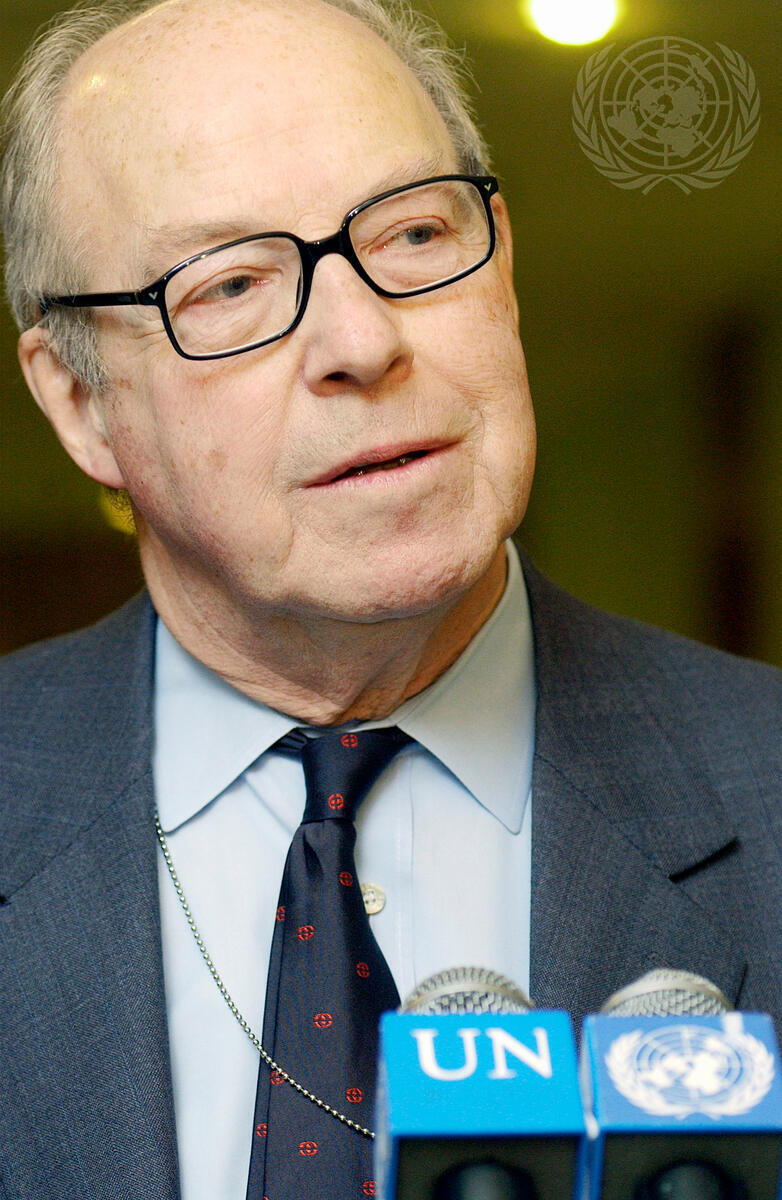 Hans Blix, Executive Chairman of the UN Monitoring, Verification and Inspection Commission (UNMOVIC), briefs correspondents at UN Headquarters after closed meetings concluded today.