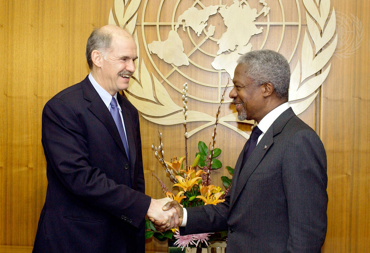 Secretary-General Kofi Annan (right) meets with George Papandreou, Minister for Foreign Affairs of Greece.