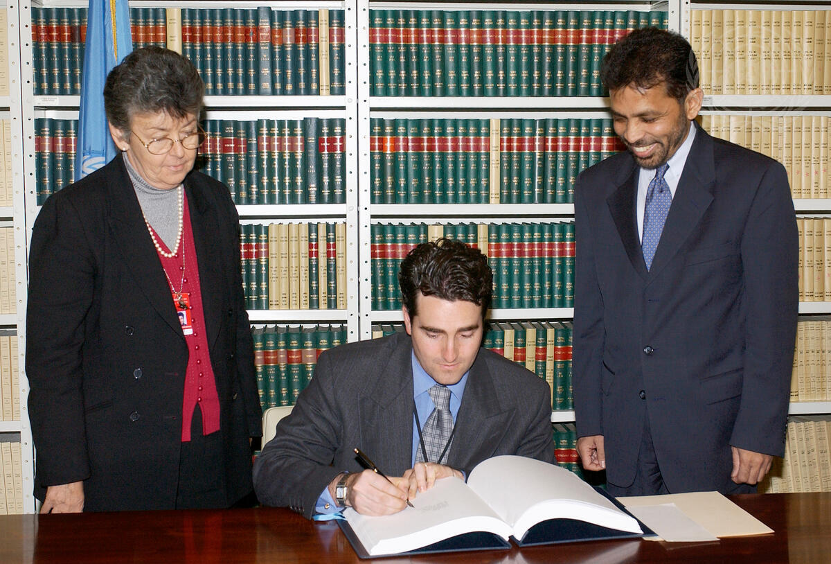 Bruno Stagno Ugarte (seated), Permanent Representative of Costa Rica to the United Nations, signs the Protocol to the Convention Against Torture and other Cruel, Inhuman or Degrading Treatment or Punishment. To the right is Palitha T.B. Kohona, Chief of the Treaty Section.