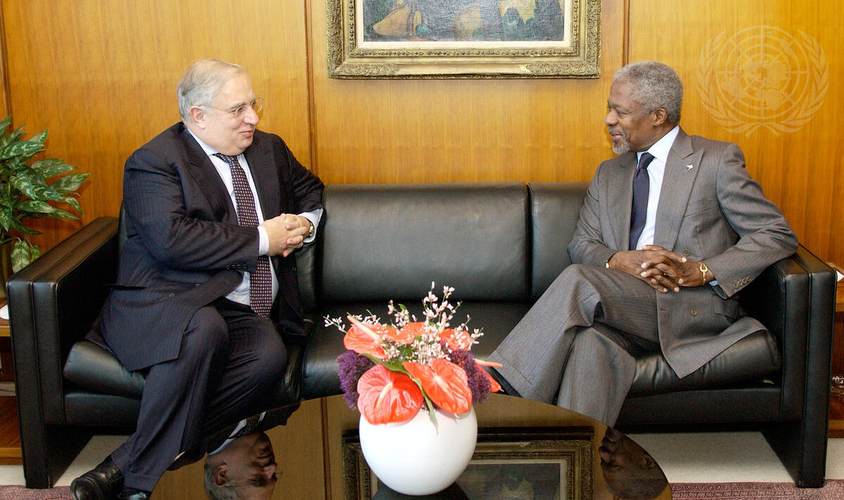 Secretary-General Kofi Annan (right) meets with P.D. Sutherland, Chairman of BP and European Chairman of the Trilateral Commission.