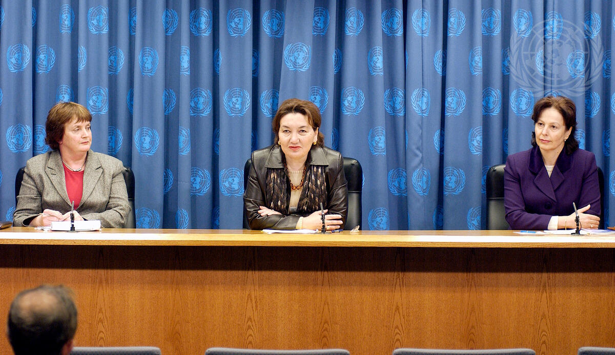 Seated from left to right are: Carolyn Hannan, Director, Division for the Advancement of Women; Feride Acar, PHD, Department of Political Science and Public Administration, Middle East Technical University (METU); and Victoria Popescu Sandru, Director of the United Nations, Department, Minister Counsellor, Ministry of Foreign Affairs, and Member of the Romanian Intermenstrual Council on Equality of Opportunities between Women and Men.