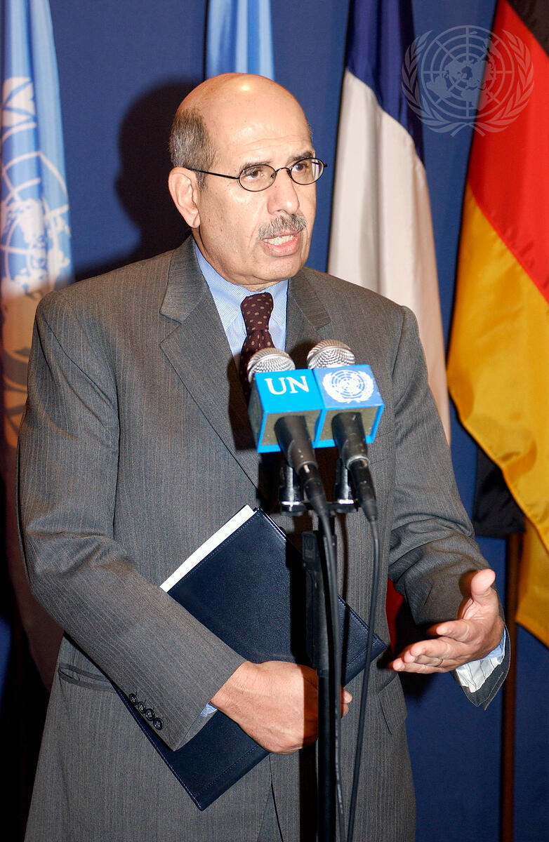 Mohamed ElBaradei (Egypt), Director General of the International Atomic Energy Agency (IAEA), addresses correspondents at the Security Council stakeout today.