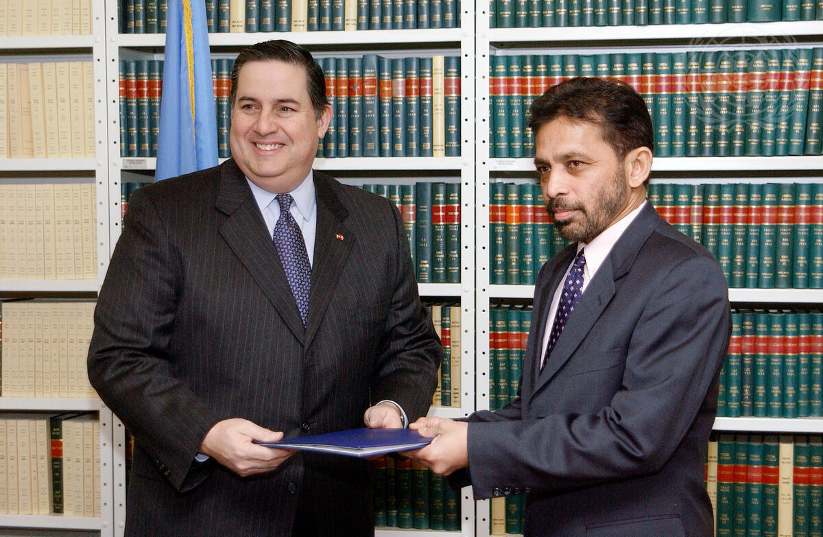 Eduardo J. Sevilla Somoza (left), Permanent Representative of Nicaragua to the United Nations, deposits the Instrument of Ratification of the International Convention for the Suppression of Terrorist Bombings, to Palitha T.B. Kohona, Chief, Treaty Section.