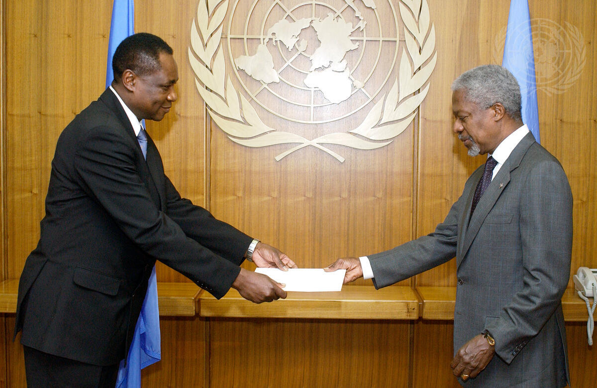Fernand Poukre-Kono (left), the new Permanent Representative of the Central African Republic to the United Nations, presents his credentials to Secretary-General Kofi Annan.