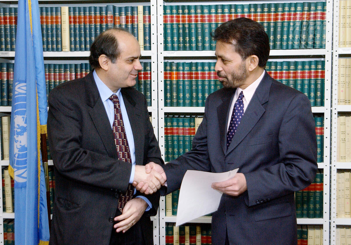 Sotirios Zackheos (left), Permanent Representative of the Republic of Cyprus to the United Nations, deposits the Instrument of Ratification of the Convention of the Prohibition of the Use, Stockpiling, Production and Transfer of Anti-Personnel Landmines and on their Destruction, to Palitha T.B. Kohona, Chief, Treaty Section.