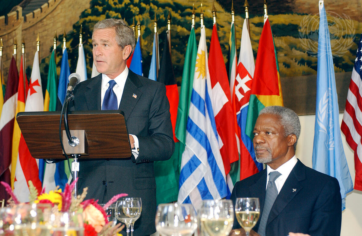 George W. Bush (left), President of the United States, speaking at today's luncheon in honour of the Heads of State and Government attending the fifty-ninth session of the General Assembly hosted by Secretary-General Kofi Annan, who looks on.