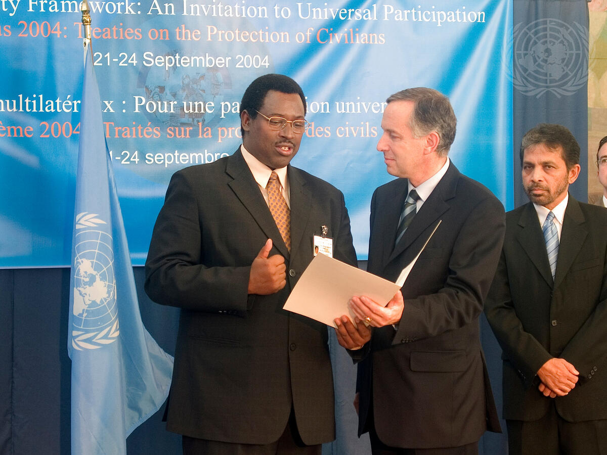 Térence Sinunguruza (left), Minister for Foreign Affairs of the Republic of Burundi, deposits the Instruments of Ratification of the ""Rome Statute of the International Criminal Court"".