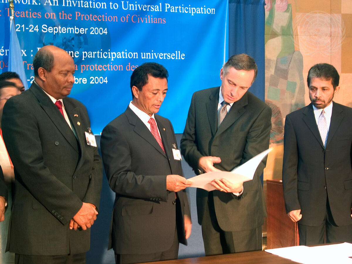 Marc Ravalomanana, President of the Republic of Madagascar, deposits the Instruments of Ratification of the ""Optional Protocol to the Convention on the Rights of the Child on the involvement of children in armed conflict"", of the ""Optional Protocol to the Convention on the Rights of the Child on the sale of children, child prostitution and child pornography"", of the ""WHO Framework Convention on Tobacco Control"", of the ""United Nations Convention against Corruption"" and of the ""Rotterdam Convention on the Prior Informed Consent Procedure for Certain Hazardous Chemicals and Pesticides in International Trade"".
