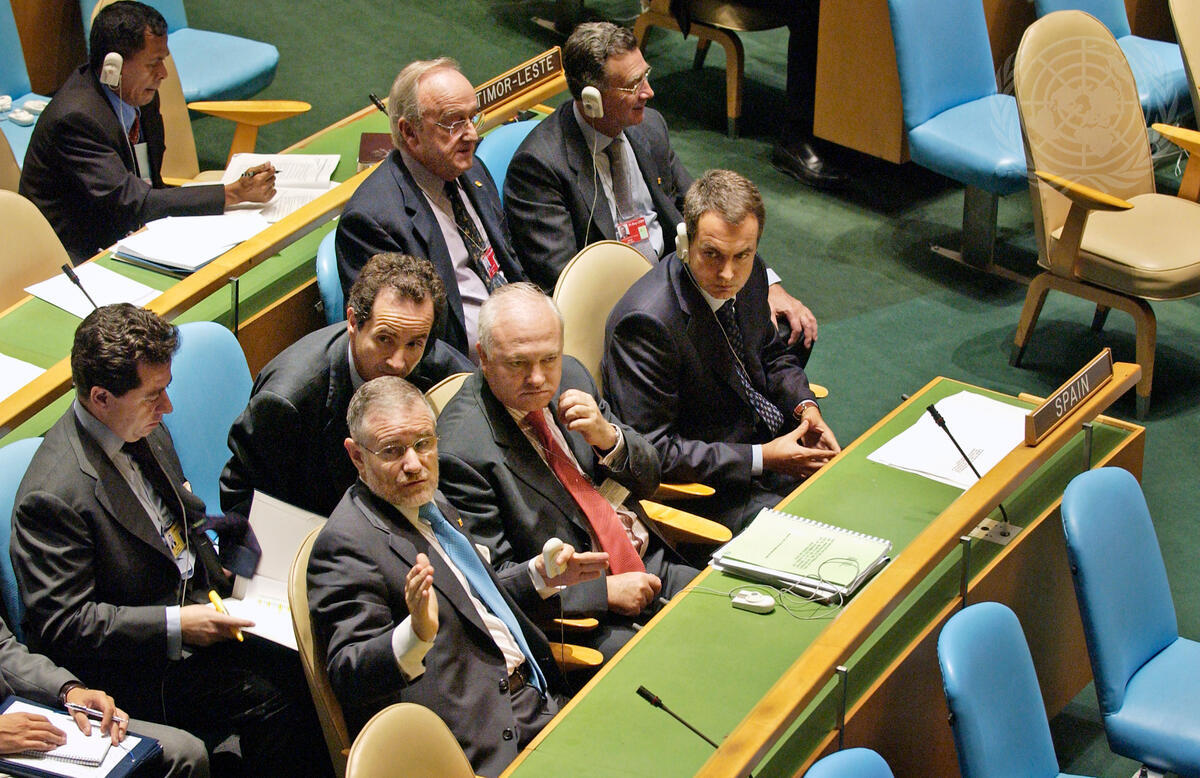 The delegation of Spain, headed by José Luis Rodríguez Zapatero (behind nameplate), Prime Minister of Spain, at the fifty-ninth session of the General Assembly.