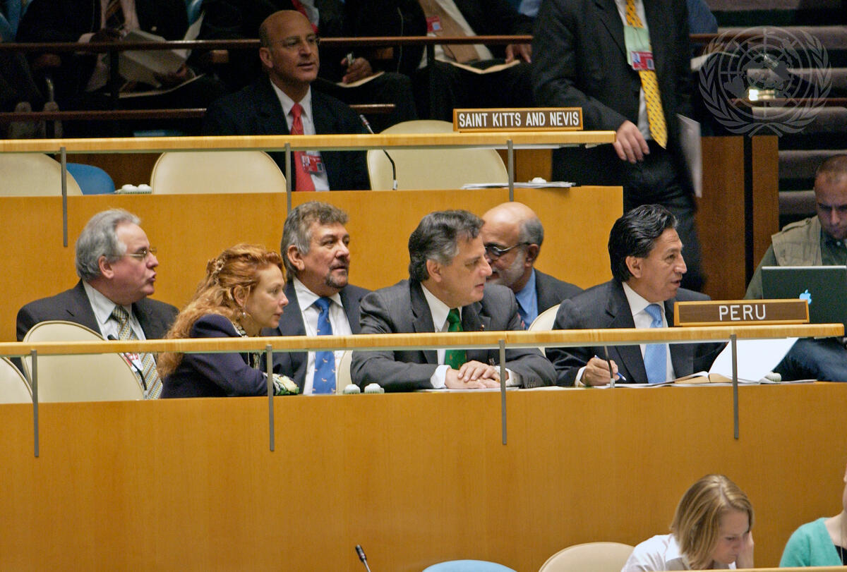 The delegation of Peru, headed by Alejandro Toledo Manrique (behind nameplate), President of Peru, at the fifty-ninth session of the General Assembly.
