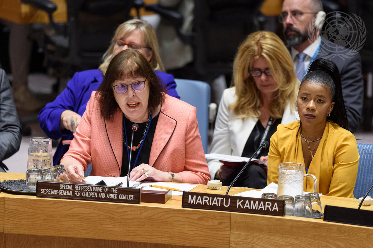 Virginia Gamba, Special Representative of the Secretary-General for Children and Armed Conflict, briefs the Security Council on children and armed conflict. At right is Mariatu Kamara, UNICEF Canada Ambassador.