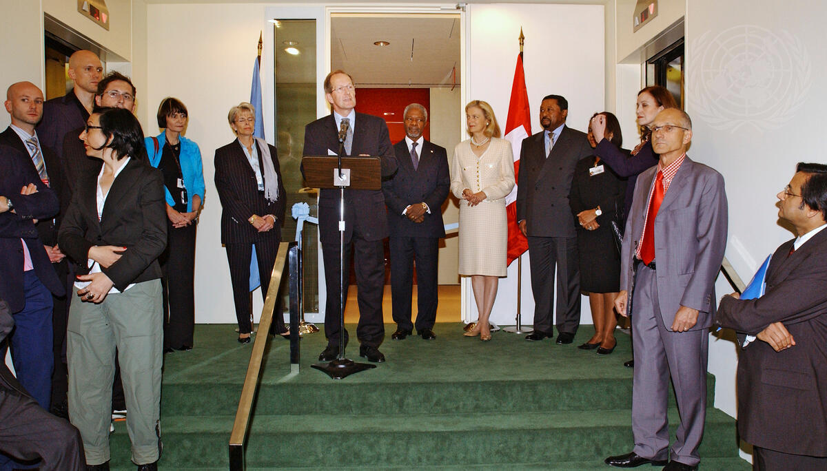 Joseph Deiss (centre), President of Switzerland, speaking at the inauguration a renovated GA-200 . Behind him, left to right: Secretary-General Kofi Annan, Mrs. Nane Annan and Jean Ping (Gabon), President of the fifty-ninth session of the General Assembly.