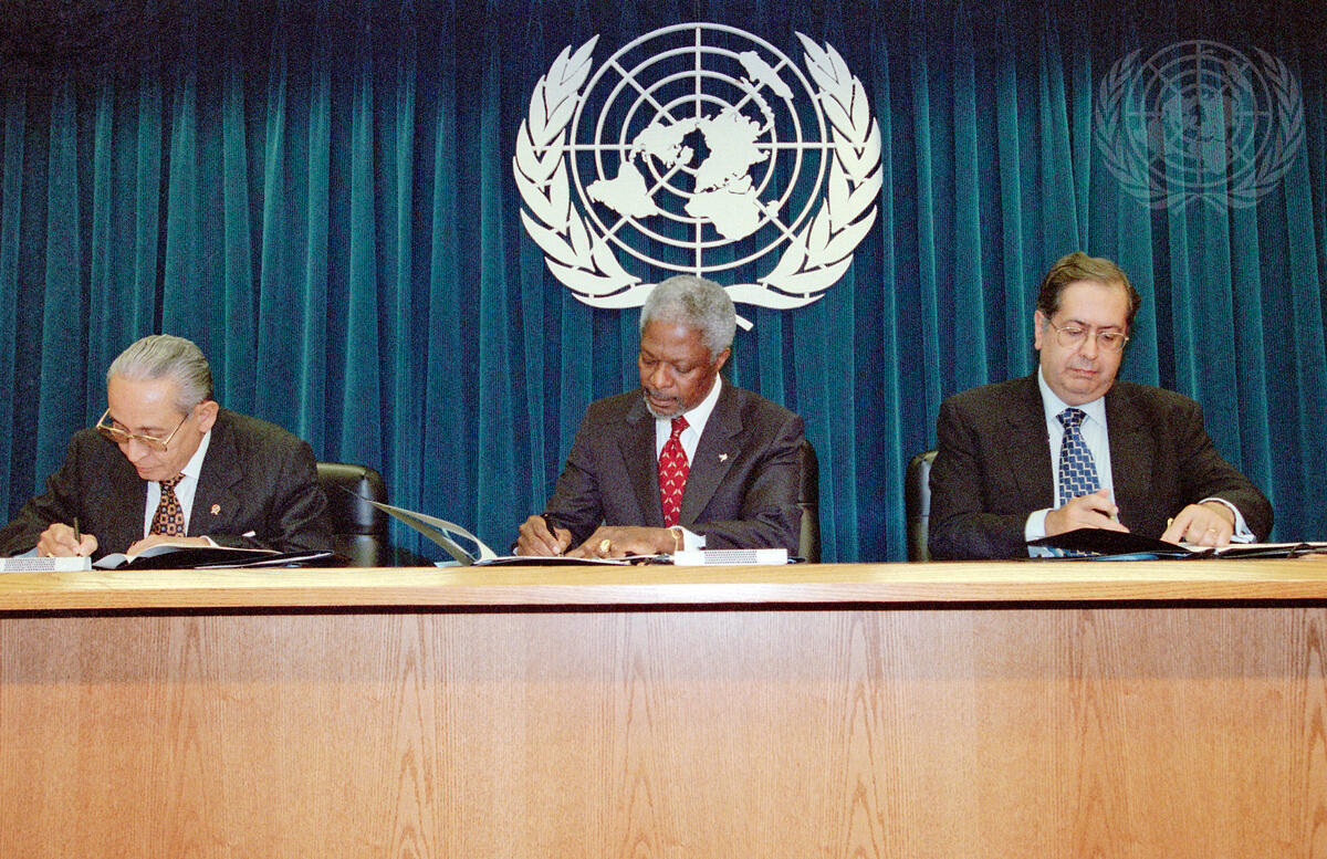 Secretary-General Kofi Annan, Foreign Minister Ali Alatas of Indonesia (left) and Foreign Minister Jaime Gama of Portugal (right) sign their historic Agreement on East Timor. The Agreement and its two supplementary agreements lay out the terms for population consultation, by which the people of East Timor will determine their future status.