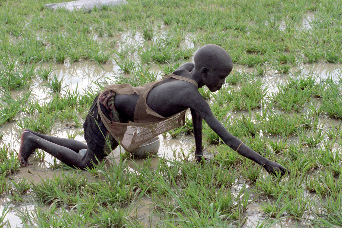 A young boy collects the spilled grains from the air drop of food supplies by the World Food Programme.