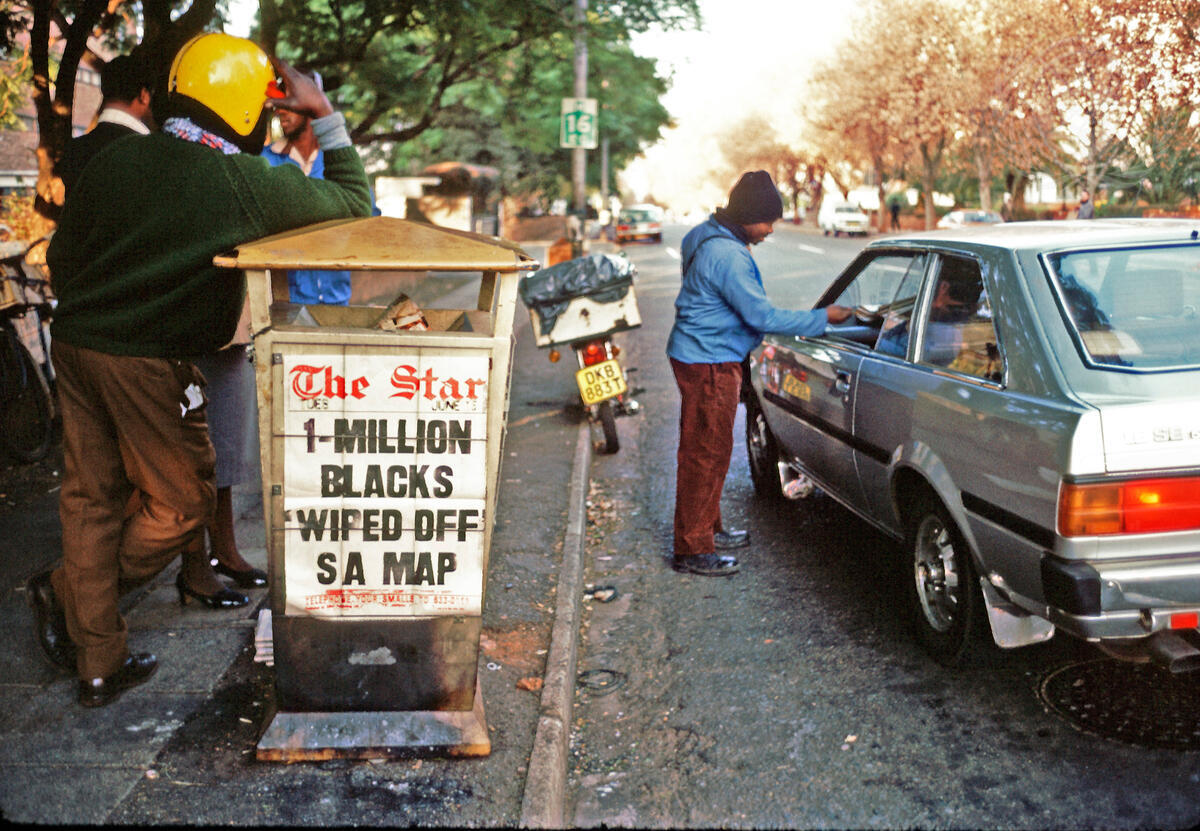 Newspaper headline on a Johannesburg street refers to a government plan in 1982 to cede territory and people to Swaziland. The people in question were not consulted in the matter. [1982]