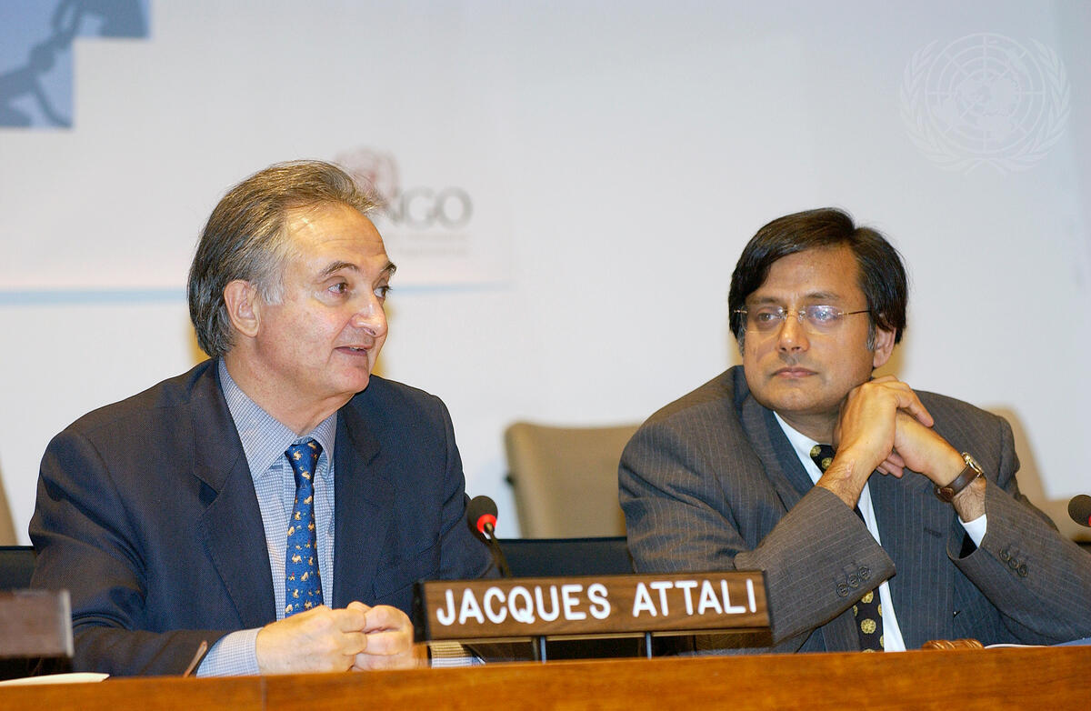 Jacques Attali (left), President of ""Planet Finance"", and founder and former President of the European Bank for Reconstruction and Development, addressing the closing conference. At right is Shashi Tharoor, Under-Secretary-General for Communications and Public Information.