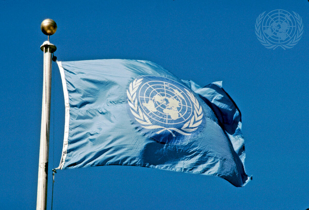 The Flag of the United Nations - white emblem on light blue field - flies from pole in front of the United Nations Headquarters in New York.