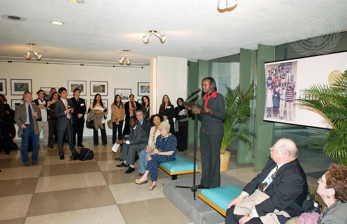 A photographic exhibition, entitled ""Through the Eyes of Children: The Rwanda Project,"" opened today in the Visitors' Lobby. Using disposable cameras, the children of Rwanda took pictures, exploring their own vision as the country struggled to rebuild. Jacqueline Murekatete (centre), genocide survivor, speaking at the opening ceremony.