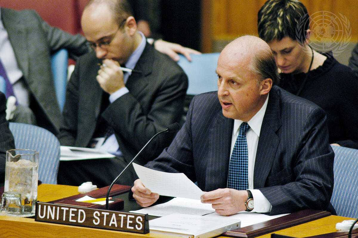 John D. Negroponte (right), Permanent Representative of the United States to the United Nations, briefed the Security Council this morning on the situation in Iraq. Voicing hope that the United Nations would return its personnel to Iraq to help with the transition to sovereignty, he suggested the establishment of a new multinational force dedicated to protecting the United Nations in Iraq.