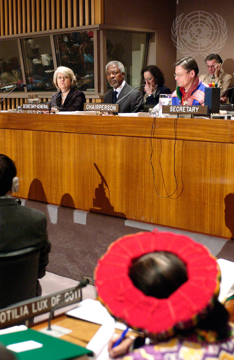 The Permanent Forum on Indigenous Issues met today to open its third session, elect its officers, and adopt the agenda and organization of work. Left to right at the podium: Marjatta Rasi, President of the Economic and Social Council, Mr. Annan, and Ole Henrik Magga, Chairperson of the Forum.