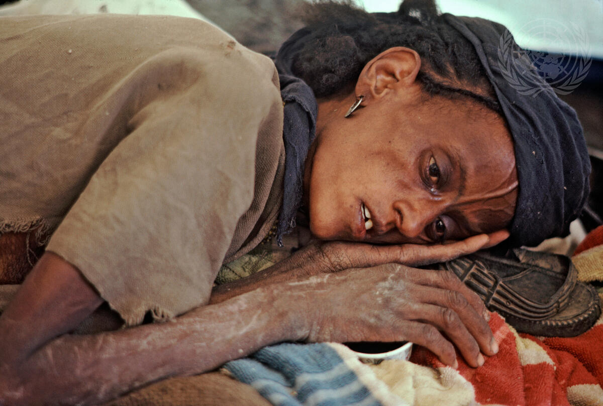 A drought victim, newly-arrived at a camp in Makalle in northern Ethiopia, lies unconscious awaiting medical treatment.
