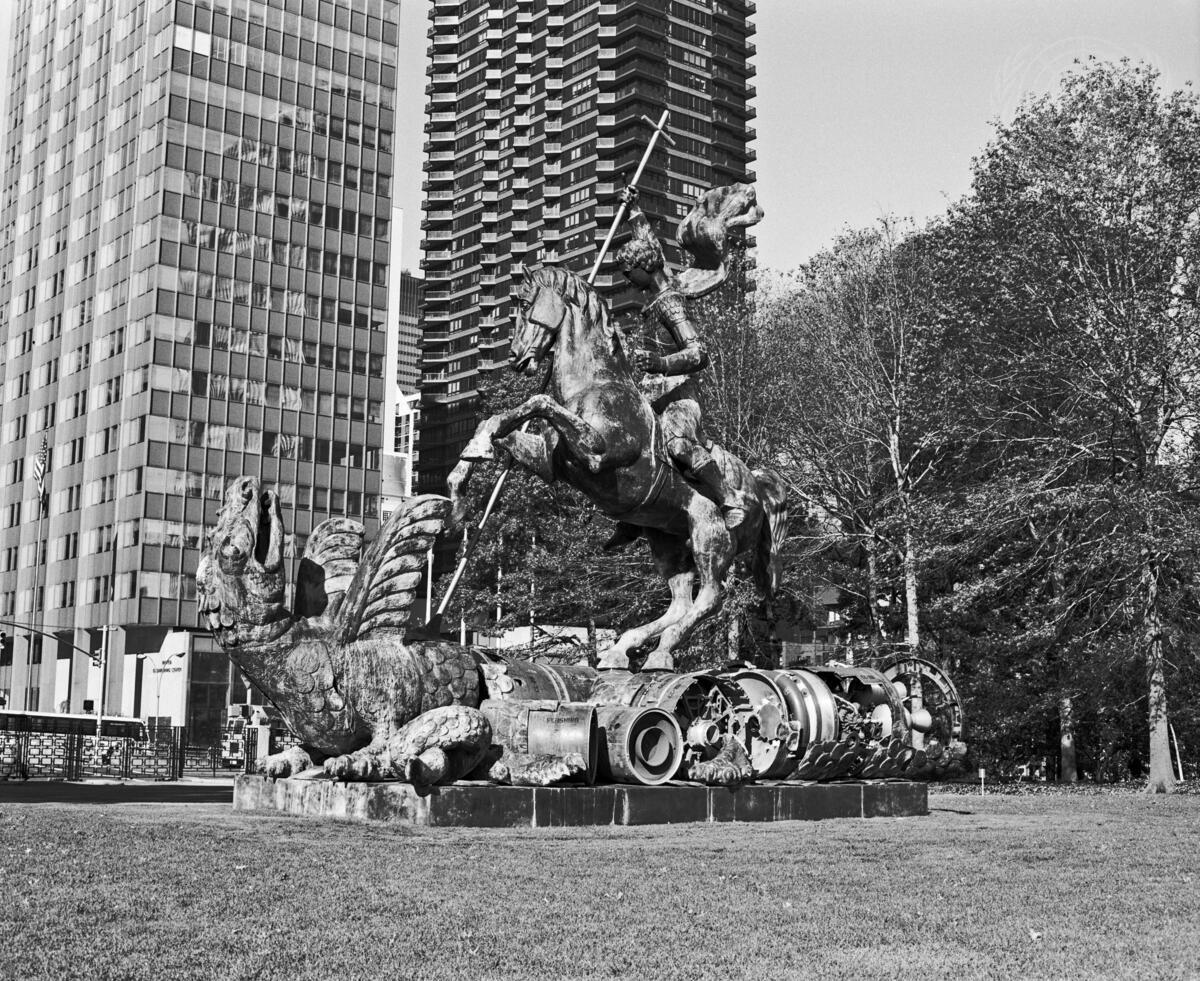 The Soviet Union presented a sculpture, 'Good Defeats Evil' to the United Nations on the occasion of the 45th anniversary of the organization in October. Standing 39 feet high and weighing 40 tons, the solid bronze sculpture depicts St. George on horseback poised triumphantly over the Dragon. As the Dragon is made from actual parts of a Soviet SS-20 and an American Pershing II nuclear missiles, it represents the specter of nuclear war. The sculpture is the creation of Zurab Tsereteli, Artist Laureate of the Soviet Union. His sculpture commemorates the dismantling of the missiles under the Intermediate-Range Nuclear Forces (INF) Treaty signed 8 December, 1987 by Presidents Ronald Reagan of the United States and Mikhail Gorbachev of the Soviet Union.