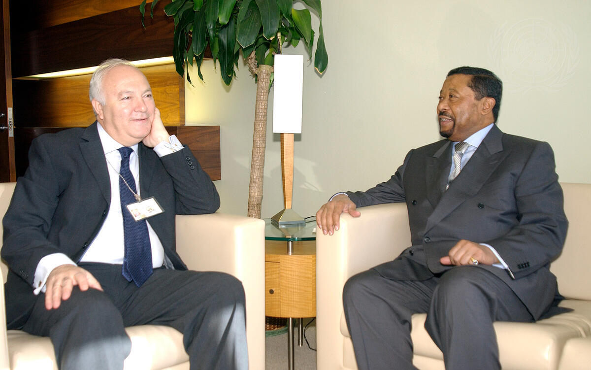 Jean Ping (right), Present of the fifty-ninth session of the General Assembly, meets with Miguel Angel Moratinos Cuyaubé, Minister of Foreign Affairs of Spain.