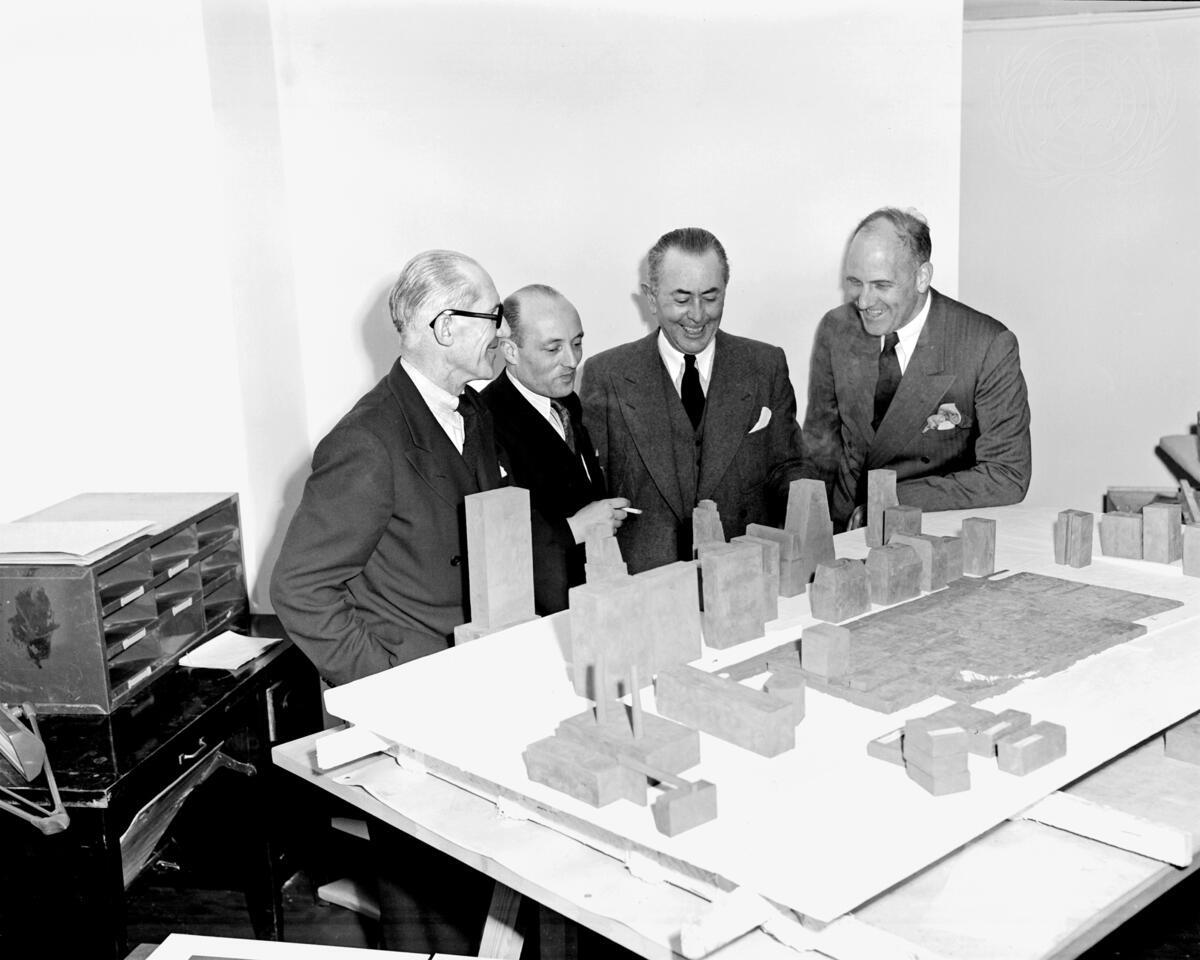 Members of the Board of Design Consultants assisting Wallace K. Harrison (right), Director of Planning for United Nations permanent Headquarters. Studying models of buildings now surrounding the future capital site are, left to right: Charles Le Corbusier, France; Nikolai D. Bassov, USSR; and Howard Robertson, United Kingdom. RKO Building, New York, 25 February 1947.