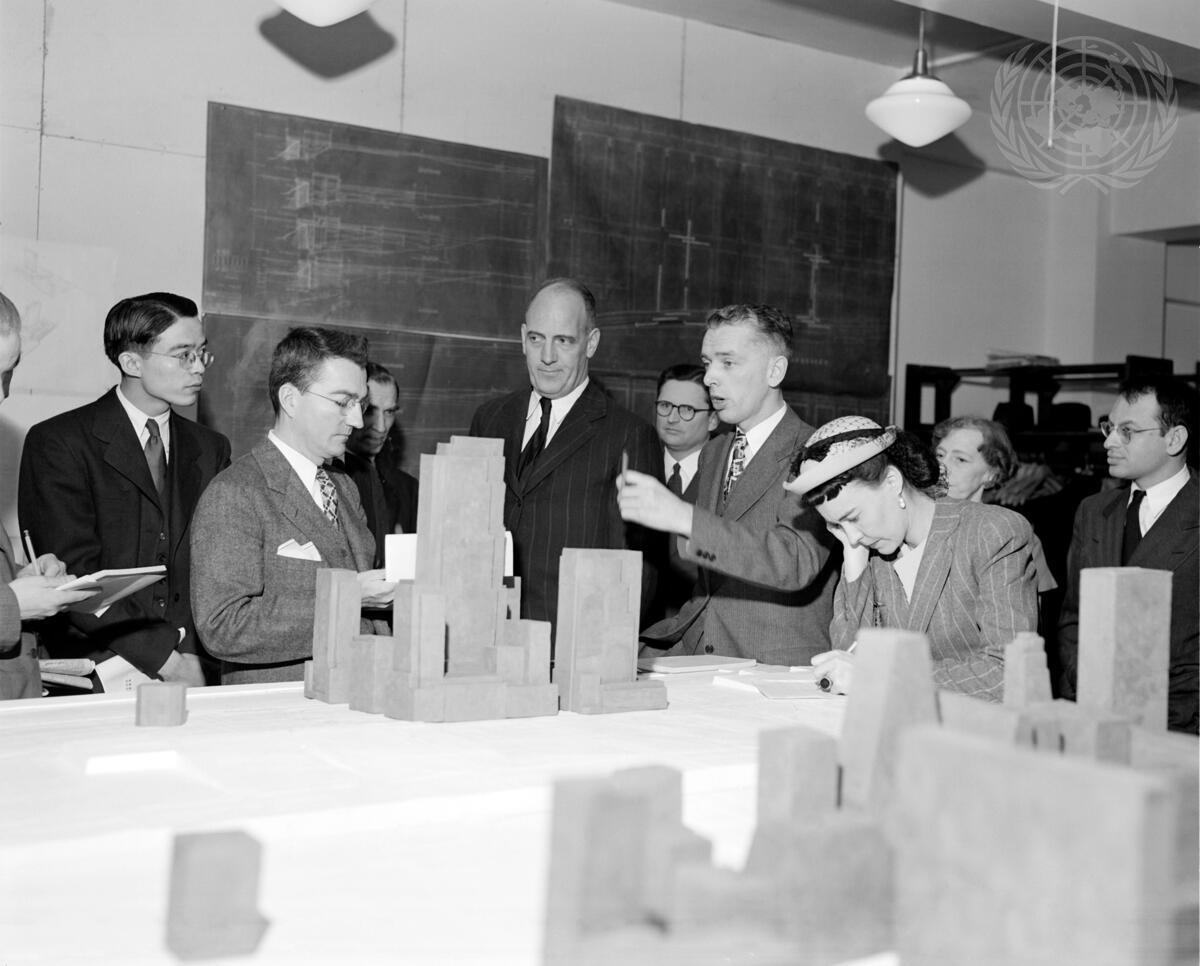 Wallace K. Harrison, Director of Headquarters Planning, explains architectural plans to members of the press.